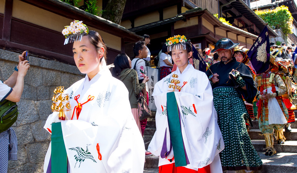 家内安全・土地守護・事業繁栄・良縁達成を祈願するお祭りで、約1000年前の天禄元年、円融天皇行幸の際、勅命により行われた臨時祭がその起源。雅楽、白川女、武者、稚児などの行列は時代絵巻さながらです。かつて地主桜を御所に献上した様子を、白川女が当時そのままに伝えます。